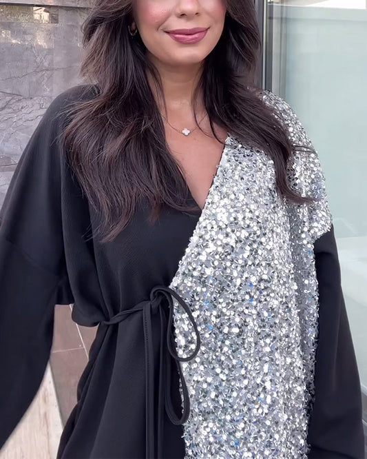 V-neck sequined lace-up blouse