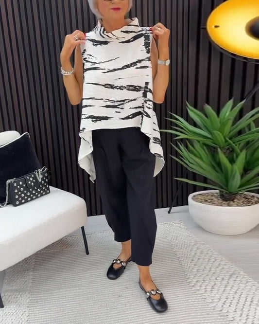 Ink Wash Painting Print Mandarin Collar Sleeveless Blouse