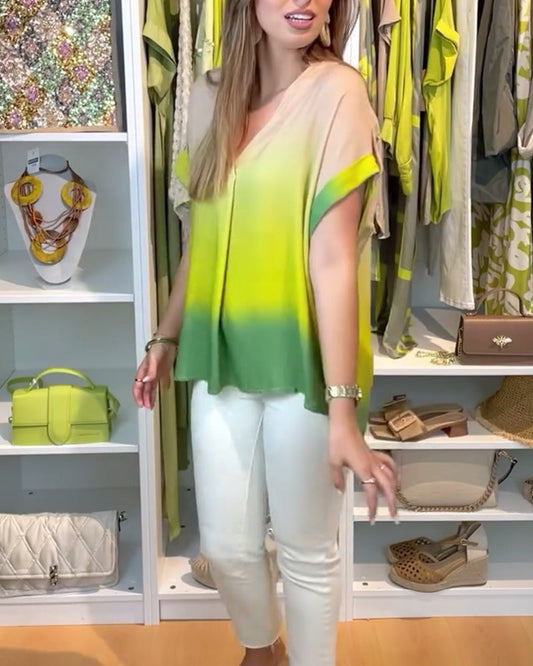 Blusa casual de manga curta com estampa gradiente e decote em V