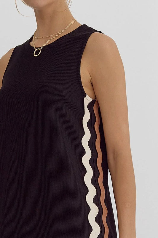 Vestido longo sem mangas com fita ondulada em cor contrastante com nervuras femininas