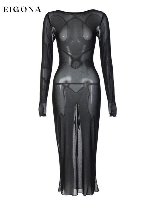 Vestido feminino de malha transparente sem costas com cadarço sexy saia midi de manga comprida vestido preto fino