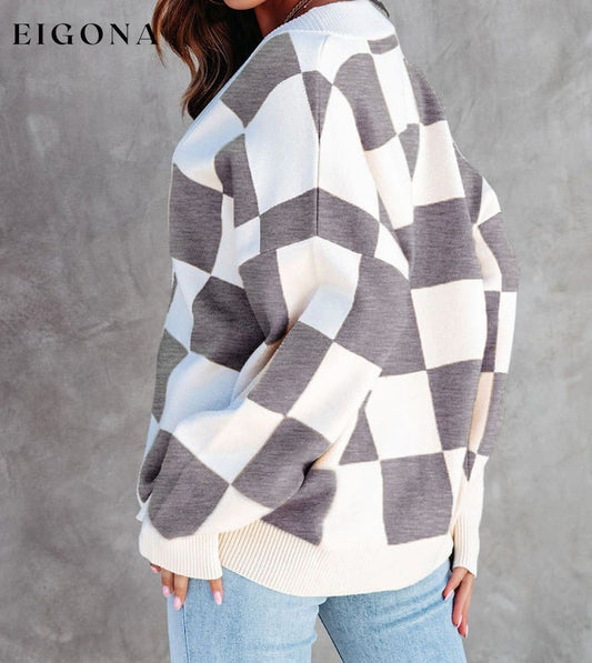 Cardigã suéter com estampa xadrez cinza contrastante com botões