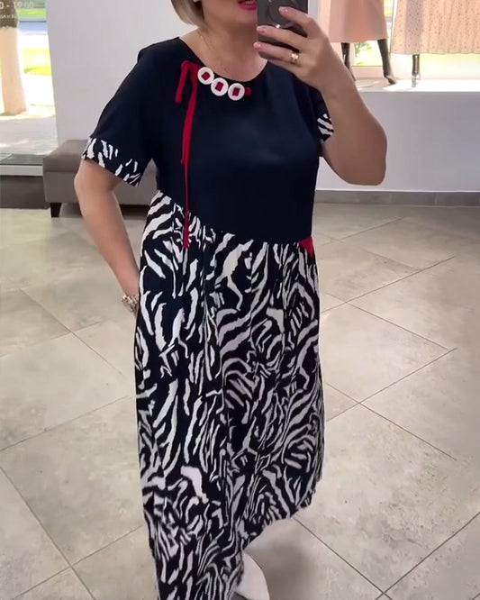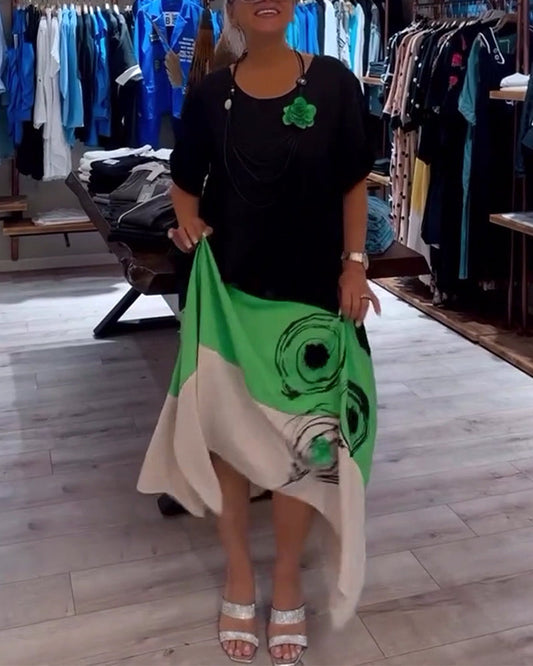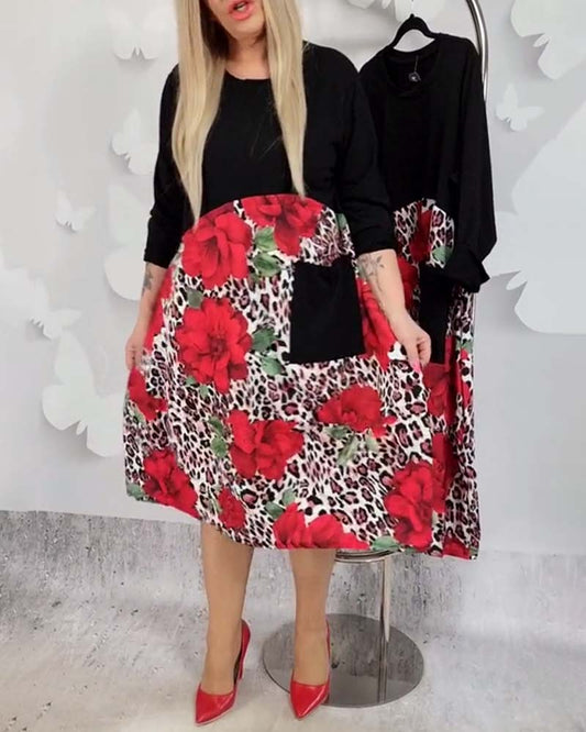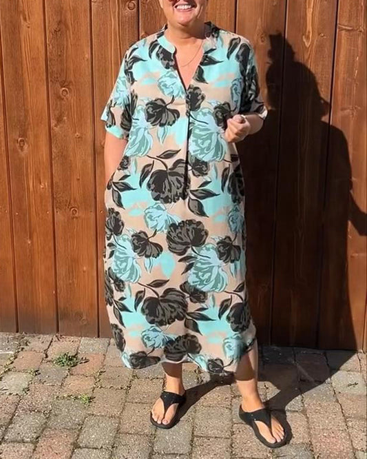 Vestido elegante com lapela e manga comprida com estampa de folhas