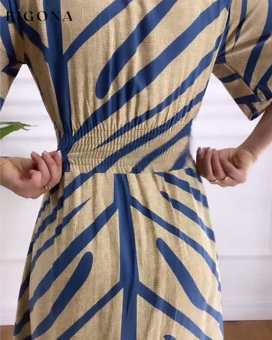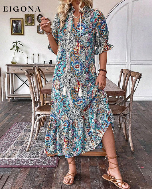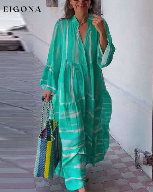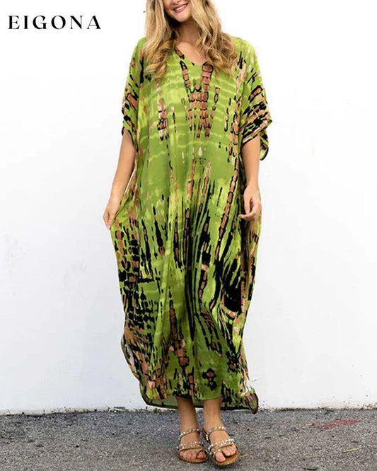 Vestido longo estampado colorblock com decote em V e bainha completa