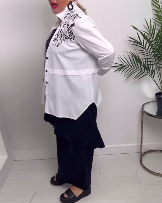 Conjunto elegante de saia irregular com estampa floral e manga trompete